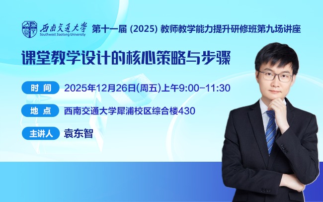 2025-12-23主题:课堂教学设计的核心策略与步骤时间:2025年12月26日(周五)上午9:00-11:30地点:犀浦校区综合楼430主要内容以小组合作与研讨的形式,与各位老师一同探讨教学设计中各关键环节的系统构建。我们将以“AI赋能...
