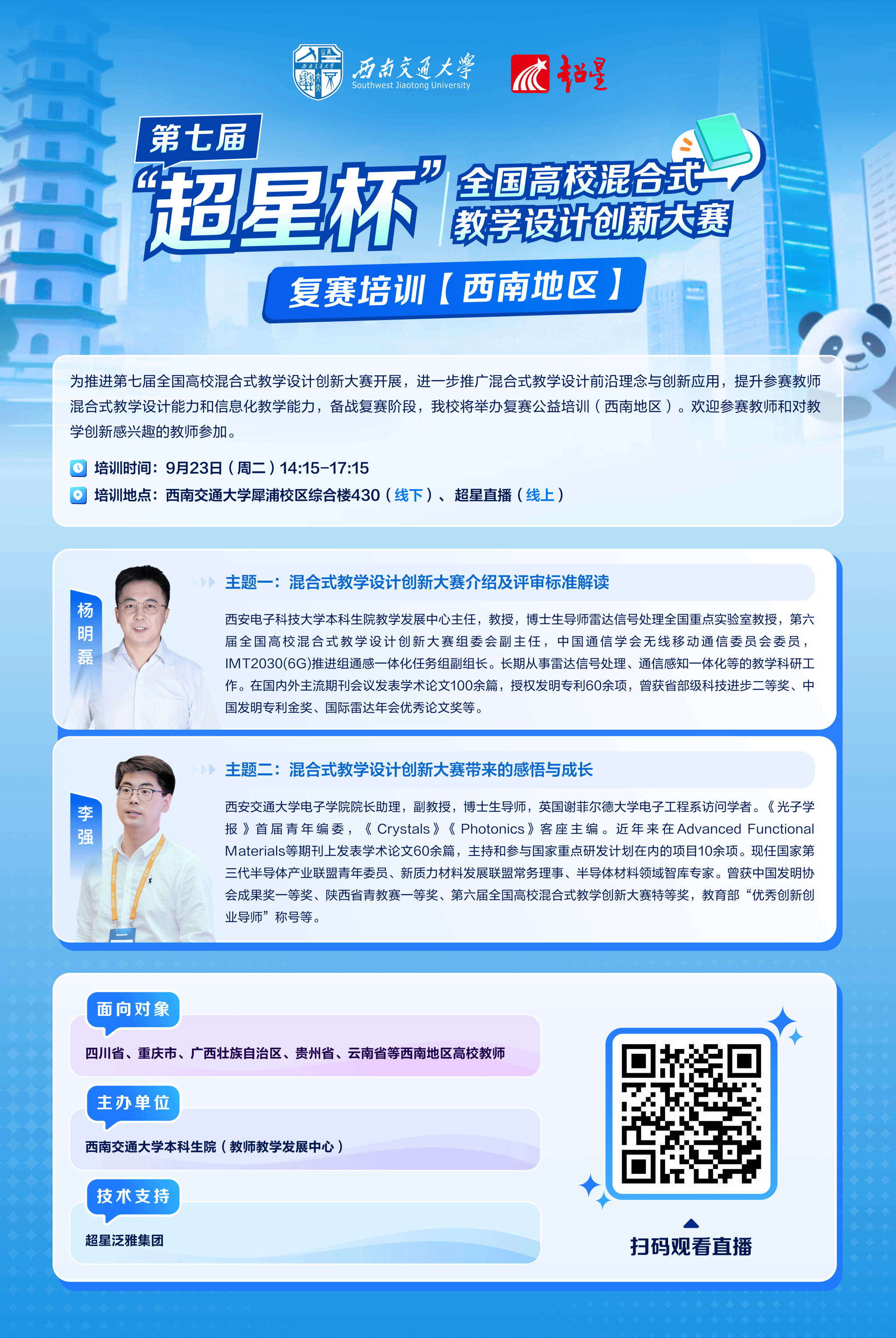 为推进第七届全国高校混合式教学设计创新大赛开展,进一步推广混合式教学设计前沿理念与创新应用,提升参赛教师混合式教学设计能力和信息化教学能力,备战复赛阶段,我校将举办复赛公益培训(西南地区)。欢迎参赛教师和对教学创新感兴趣的教师参加。具体事宜如下: