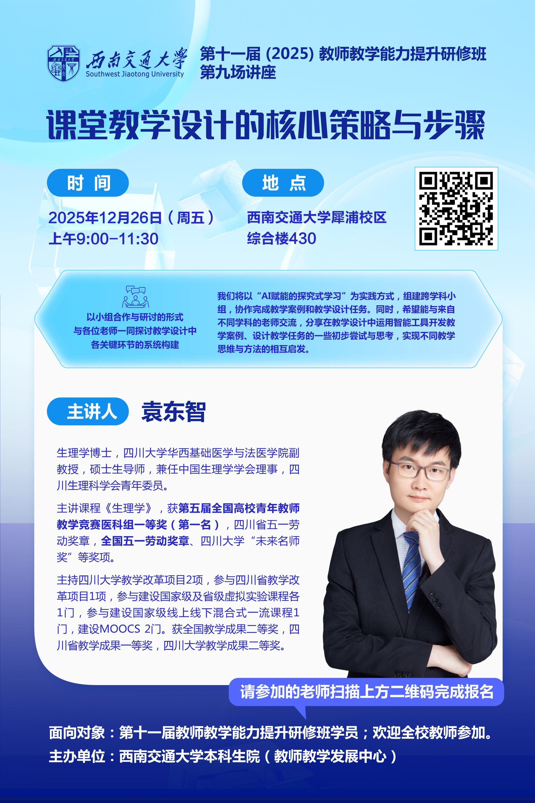 面向对象:第十一届教师教学能力提升研修班学员;欢迎全校教师参加;请参加的老师扫描海报中二维码完成报名
