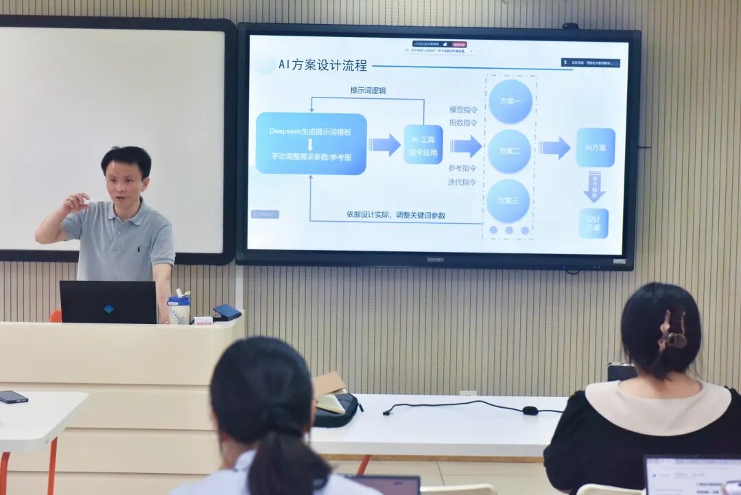 随后,杜军以视觉内容高效创作为核心,介绍了vizcom、即梦等AI工具在设计领域的广泛应用,并现场展示了这些工具如何辅助创作者快速生成创意、优化设计方案。他强调,在AI时代,教师需要从思维层面进行变革,以适应新的工具和方法。