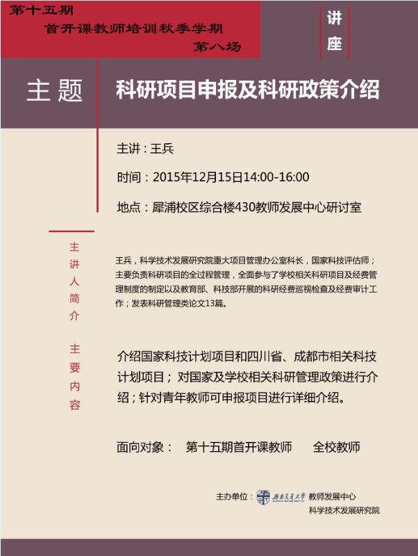 介绍国家科技计划项目和四川省、成都市相关科技计划;对国家及学校相关科研管理政策进行介绍;针对青年教师可申报项目进行详细介绍。